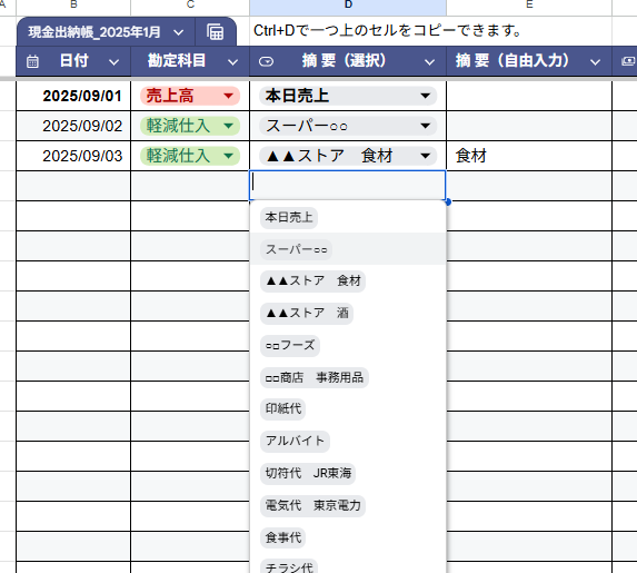 これをまとめることで、「摘要(選択)を選ぶことで自動的に勘定科目が選ばれる」という仕組みができあがります。(例:本日売上を選ぶと科目に売上高が入る)
