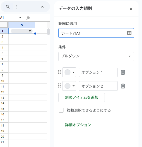 例えば、プルダウンメニューを設定する時は1つだけならこの画像のように該当セルを選んでメニューの項目を1つ1つ設定していきます。