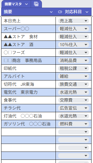 これをまとめることで、「摘要(選択)を選ぶことで自動的に勘定科目が選ばれる」という仕組みができあがります。(例:本日売上を選ぶと科目に売上高が入る)