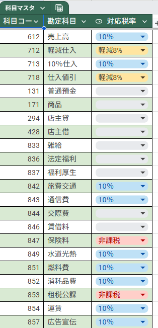 「スプレッドシートで現金出納帳」の記事で、「摘要(選択)を選ぶと自動的に科目と税率が入る」という仕組みを説明しましたが、このマスタを利用しています。